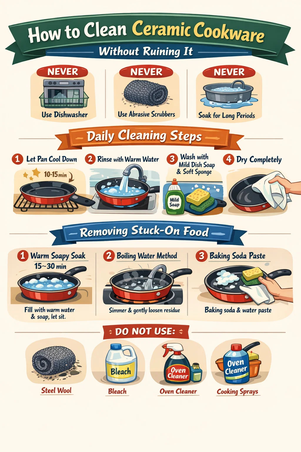 Los estudios y los informes de los usuarios muestran consistentemente que La limpieza inadecuada es la razón número uno por la que los revestimientos cerámicos antiadherentes fallan prematuramente — a menudo en un plazo de 6 a 12 meses en lugar de los 3 a 5 años que puede durar una sartén bien mantenida. Esta guía cubre todos los escenarios de limpieza que encontrará, desde el mantenimiento diario hasta los residuos quemados rebeldes.