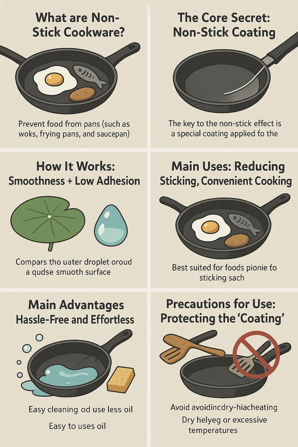 En pocas palabras, son ollas y sartenes (como woks, sartenes y cacerolas) cuya superficie interior ha sido tratada especialmente para evitar que los alimentos se peguen al fondo durante la cocción. Cuando salteas, fríes huevos o fríes pescado, la comida no se pegará fácilmente al fondo de la sartén.