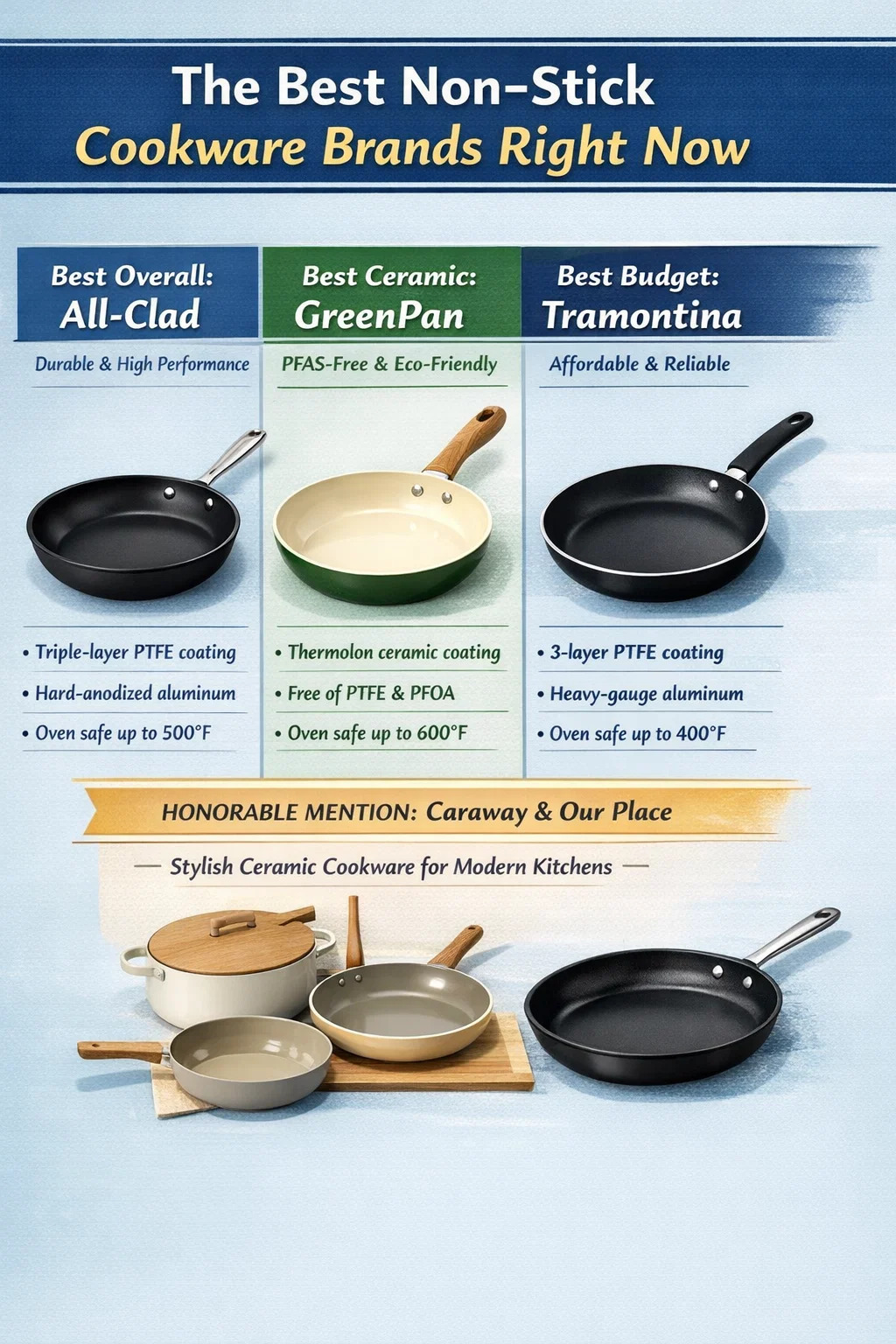 Si quieres una respuesta directa: Todo revestido, Zwilling y Pan verde se clasifican constantemente como las mejores marcas de utensilios de cocina antiadherentes a través de revisiones profesionales, comunidades de cocineros caseros y pruebas de laboratorio independientes. All-Clad lidera la durabilidad y el rendimiento, Zwilling (con su línea Demeyere) sobresale para los cocineros serios y GreenPan encabeza el segmento de cerámica antiadherente para quienes evitan los recubrimientos a base de PTFE.